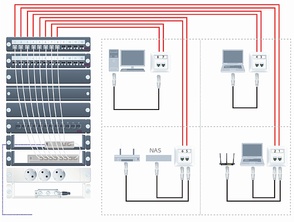 Oppsettet gjør det enkelt å utnytte nettverksressurser som bredbånd, TV, skrivere, scannere og harddisker. Hjemmesentralen fra signalleverandøren din er typisk utstyrt med 2 porter for telefoni, 1 port for bredbånd og 3 porter for IPTV. Telefonsignaler hentes ut fra telefonporten og spres via telefonpanelet, som gir 2x6 eller 1x12 tilkoblinger. Det gir deg mulighet for å bruke opptil 12 telefoner.